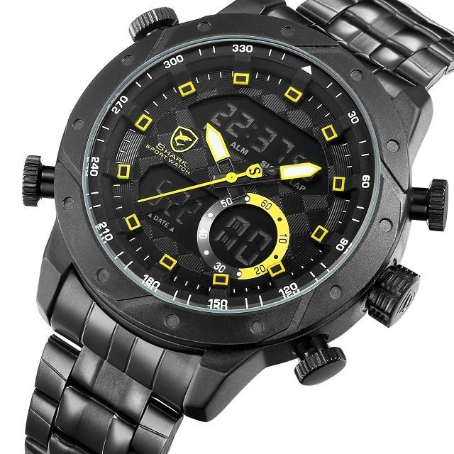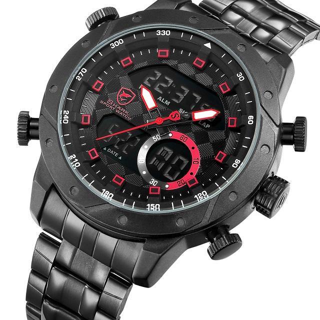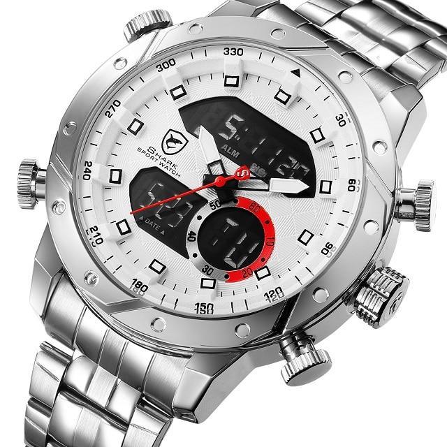 Snaggletooth SHARK Sport Watch LCD Auto Date Alarm Steel Band Chronograph Dual Time Men Relogio Quartz Digital Wristwatch /SH589